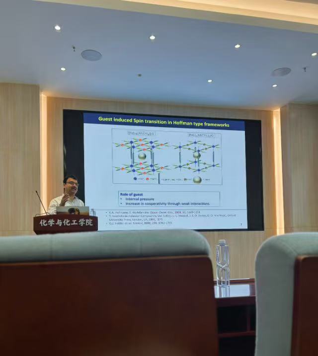 Sanjit Konar教授围绕霍夫曼型自旋交叉配合物和Fe-Co普鲁士蓝类似物中电子转移协同自旋转变现象,从以下三个维度进行系统性阐述:(1)在客体分子对霍夫曼配位聚合物自旋交叉性质的调控研究中,重点剖析气体分子与配合物的相互作用机制,揭示其对自旋交叉行为的调控规律,探讨了光磁效应及扫描速度对材料磁行为的影响机制;(2)探究金属稀释效应对自旋交叉性质的影响,通过精确调控金属中心的浓度变化,解析其对自旋交叉转变温度、回滞宽度等关键参数的影响;(3)在Fe-Co普鲁士蓝类似物中,电子转移耦合自旋转变过程中的微观作用机制,为新型自旋交叉材料的设计与开发提供理论指导。