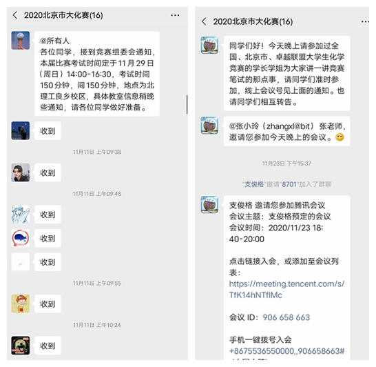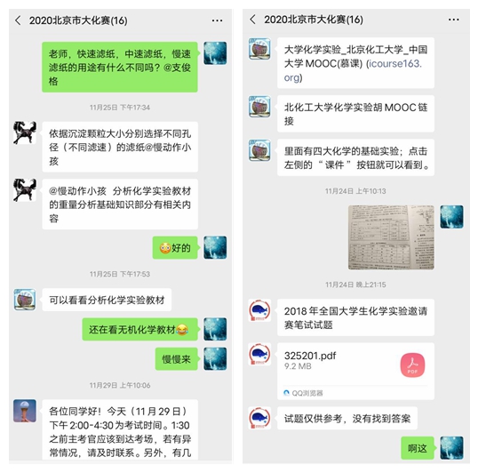参赛的各位同学们在潜心准备的同时,学院也组织曾参加过全国、北京市、卓越杯大学生化学竞赛并取得优异成绩的、有经验的学长学姐为参赛同学进行线上培训与指导,比赛前,在微信群中随时为参赛同学答疑解惑。