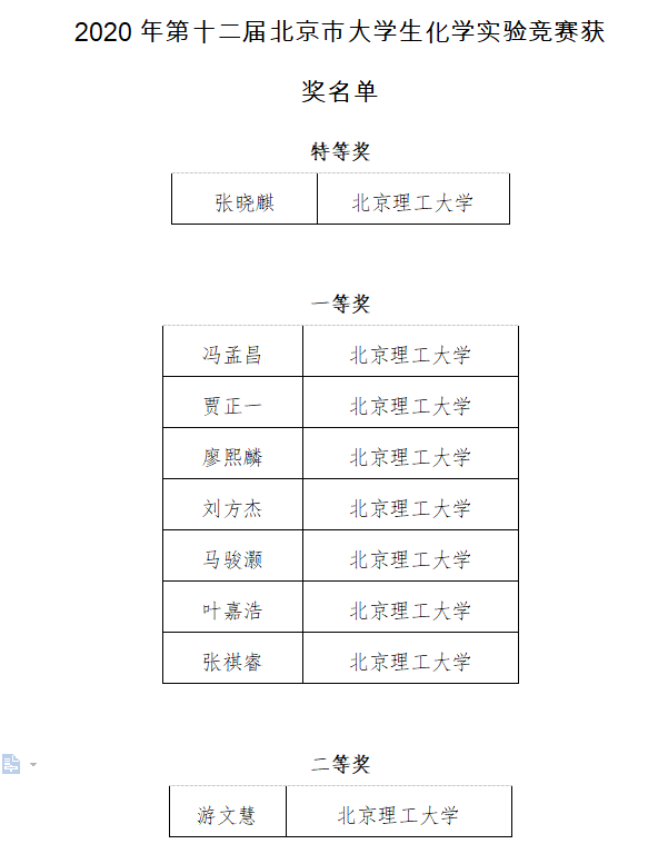 2020年12月14日,第十二届北京市大学生化学实验竞赛结果揭晓,北理工化院学子荣获特等奖1名、一等奖7名、二等奖1名。