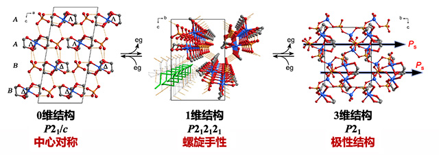 该课题组在前期通过分子指向变化调控材料力、磁物理性质等相关工作的研究基础上(Nat. Chem., 2014, 6, 1079-1083;Nat. Commum. 2019, 10, 4805-4812;Angew. Chem., Int. Ed. 2017, 56, 717-721),结合近期通过客体分子诱导晶格变化的相关报道,提出通过剥离弱螯合配体驱动单晶到单晶转变的研究思路,获得了首例基于简单螯合配体脱离、晶体结构缩合诱导的巨大并且可逆的单晶到单晶转变。通过乙二醇螯合配体的两步脱离/吸附,该材料体积可逆伸缩高达50%,质量可逆交换36%,体积与质量变化均达到目前文献报道单晶到单晶转变的最大值。同时螯合配体脱离过程中,金属中心相邻配位点空间释放,分子手性发生反转,对应单晶材料经历中心对称—螺旋手性结构—极性结构的两步可逆对称性变化。该对称性变化通过单晶X-射线衍射、变温二阶非线性光学以及CD光谱进行了详细的表征。通过比照单晶结构对称性的转变,作者对该结构变化的分子运动机理进行了深入的分析。这种具有类凝胶性质的单晶材料为柔性分子基单晶材料的合成提供了新的思路,同时基于螯合配体脱离驱动的分子手性变化为新型手性配合物的合成提供了可能的途径。