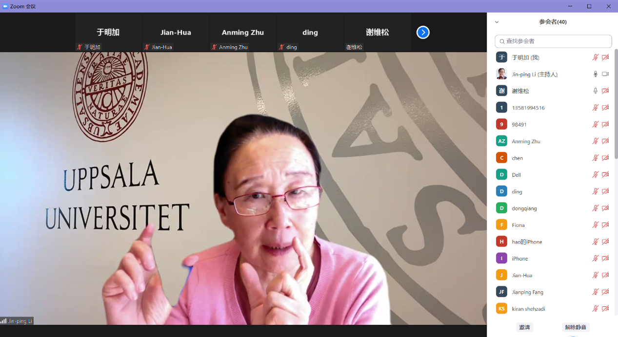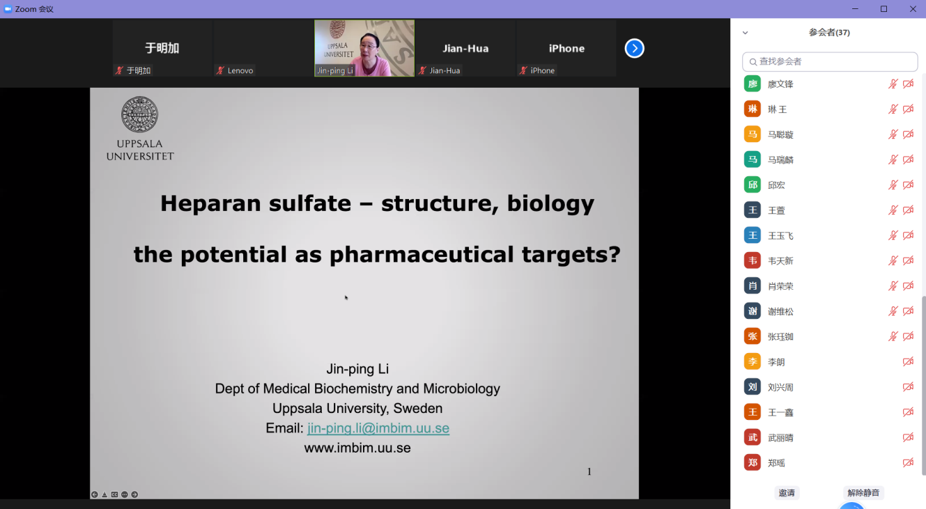 2022年4月25日下午2:30,应必威西汉姆联梁建华教授邀请,乌普萨拉大学医学院李晋萍教授做客必威西汉姆联官网“21世纪学科前沿”系列讲座,为我院广大师生带来题为“Heparan sulfate- structure, biology the potential as pharmaceutical targets”的精彩学术报告。本次报告以Zoom会议线上的方式进行,由于明加特别副研究员主持,学院师生共40余人参加。