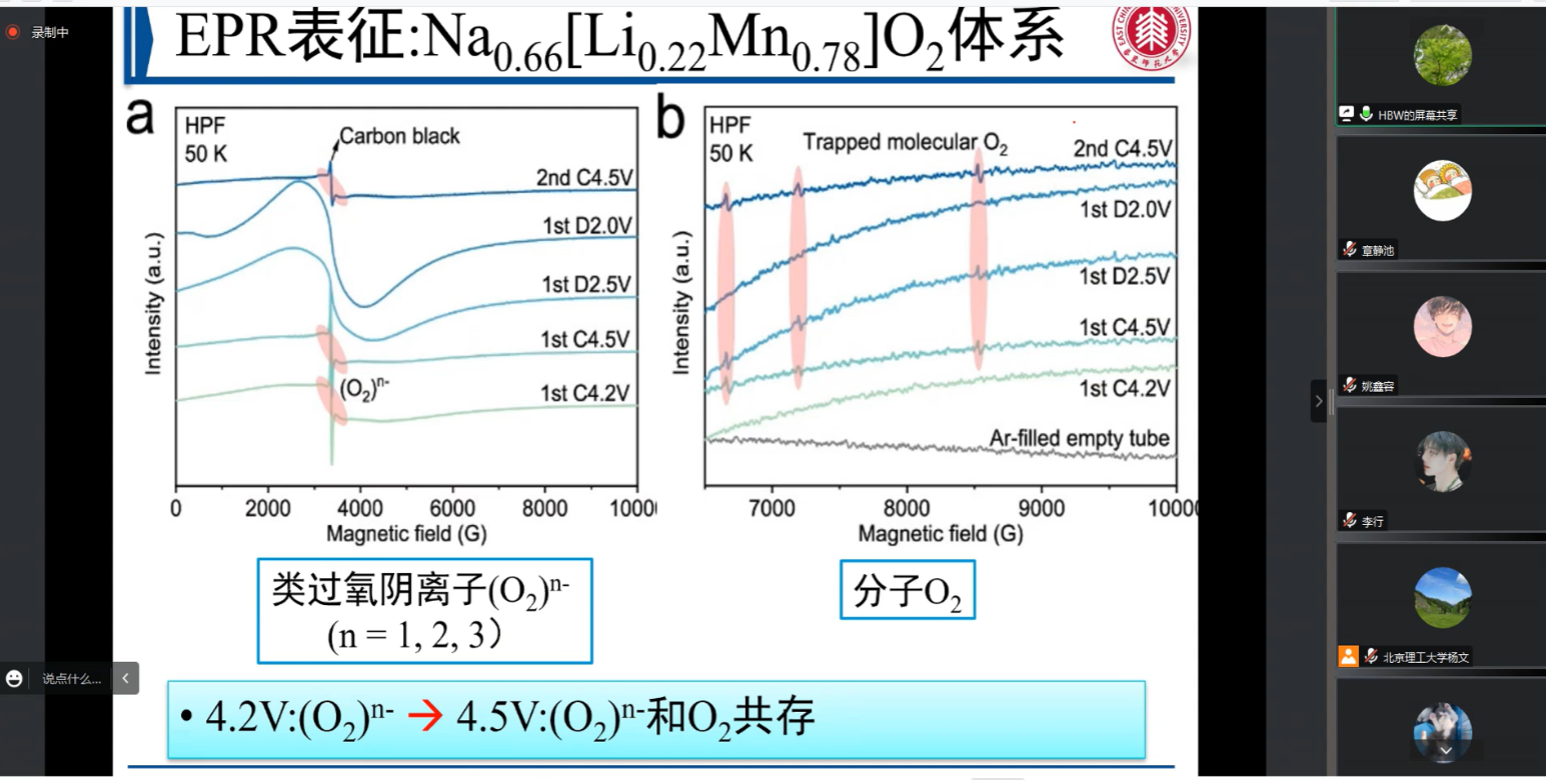 胡炳文教授在报告之初首先介绍了他的研究方向及NMR、EPR的相关知识。而后阐明报告将分为四个部分开展阐述:1)原位EPR成像: 揭示的非均匀沉积/析锂;2)NMR: LGPS基固体电解质 空间电荷层与副反应层的区分;3)NMR+EPR: trapped O2/(O2)n-的探测;4)原位锂空EPR: 揭示Co3O4的作用和LiOH的存在。胡炳文教授指出尽管无负极电池能够提高体积能量密度,但不均匀的锂沉积会加速锂枝晶的生长。而且过去对锂沉积进行的表征都是进行侧视观测,不能够得到正面的材料演变结果。经过努力,胡炳文教授课题组对谐振腔和电池进行了设计,实现了正面观测的目的,证实了锂的局部沉积与聚集。在研究过程中发现是否引入FEC对锂枝晶的生长影响比较大,当不存在FEC时锂晶体颗粒小,生成的锂枝晶比较多;有FEC时锂晶体颗粒大,生成锂枝晶比较少。通过EPR技术证实了锂枝晶的尖端生长机制。之后胡炳文教授又提出利用NMR来判断不同电势下副反应层和空间电荷层对电池体系的影响,推测空间电荷层应当有一个最优值,而针对不同体系优化方案也是不一样的。结合NMR与EPR的表征,关于过渡金属氧化物材料中O2生成的反应途径胡炳文教授认为应当是首先生成氧空穴,继而以(O2)n-状态存在,最后生成O2。而根据氧反应的存在进一步提出猜测:是否可以在首圈提高电压以激活氧反应提高容量,次圈后降低电压来减少容量衰减。结果证实电池的循环稳定性得到了提升。这主要是由于先高压后降低电压减小了LiTM的流失,稳定了晶体结构。