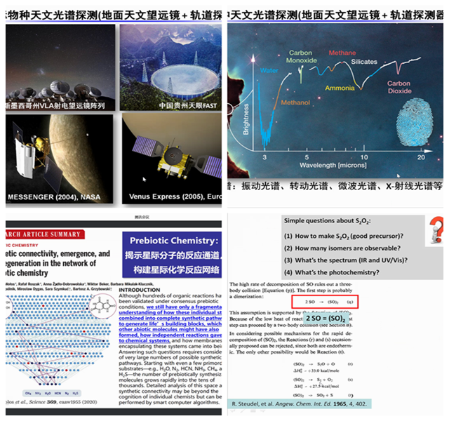 曾小庆教授首先介绍了宇宙中可能存在的一些分子离子、以及研究其在宇宙中的化学转化对生命起源的意义,并指出一些可以探测其存在的科学手段。随后以金星大气层为例,对探测器探测光谱进行分析,推测出一种SO分子可能存在于金星大气层中,并扮演着重要的角色。进一步地,曾小庆教授详细讲述了其研究硫氧分子的过程,包括如何得到较难存在于温和条件的OSSO、能观测到何种异构体、使用何种谱学方法等等。