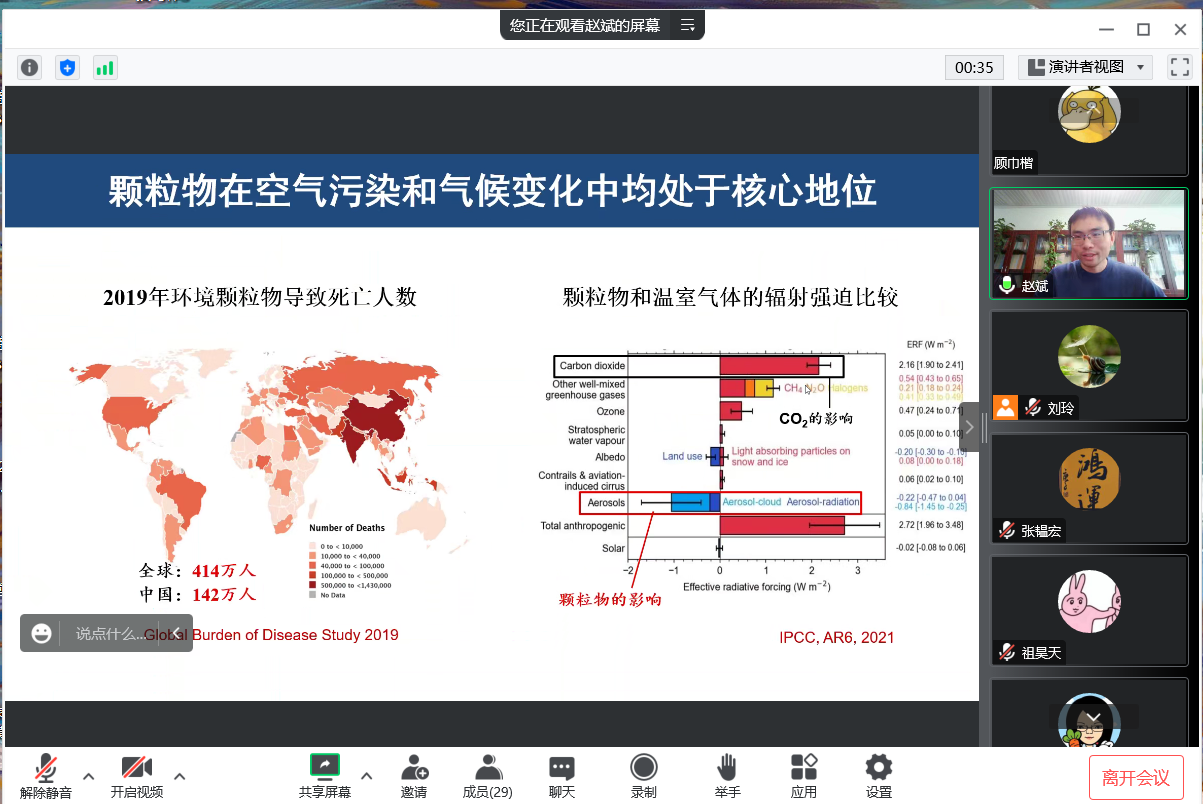 2022年11月15日下午,由必威西汉姆联官网研究生院主办,必威西汉姆联承办的北理工“21世纪学科前沿”系列讲座在腾讯会议线上举行。应必威西汉姆联张秀辉教授的邀请,清华大学的助理教授赵斌做了题为“区域和全球新粒子生成及其对云凝结核影响的数值模拟研究”的学术报告。近三十名师生参加了讲座并进行学术交流。