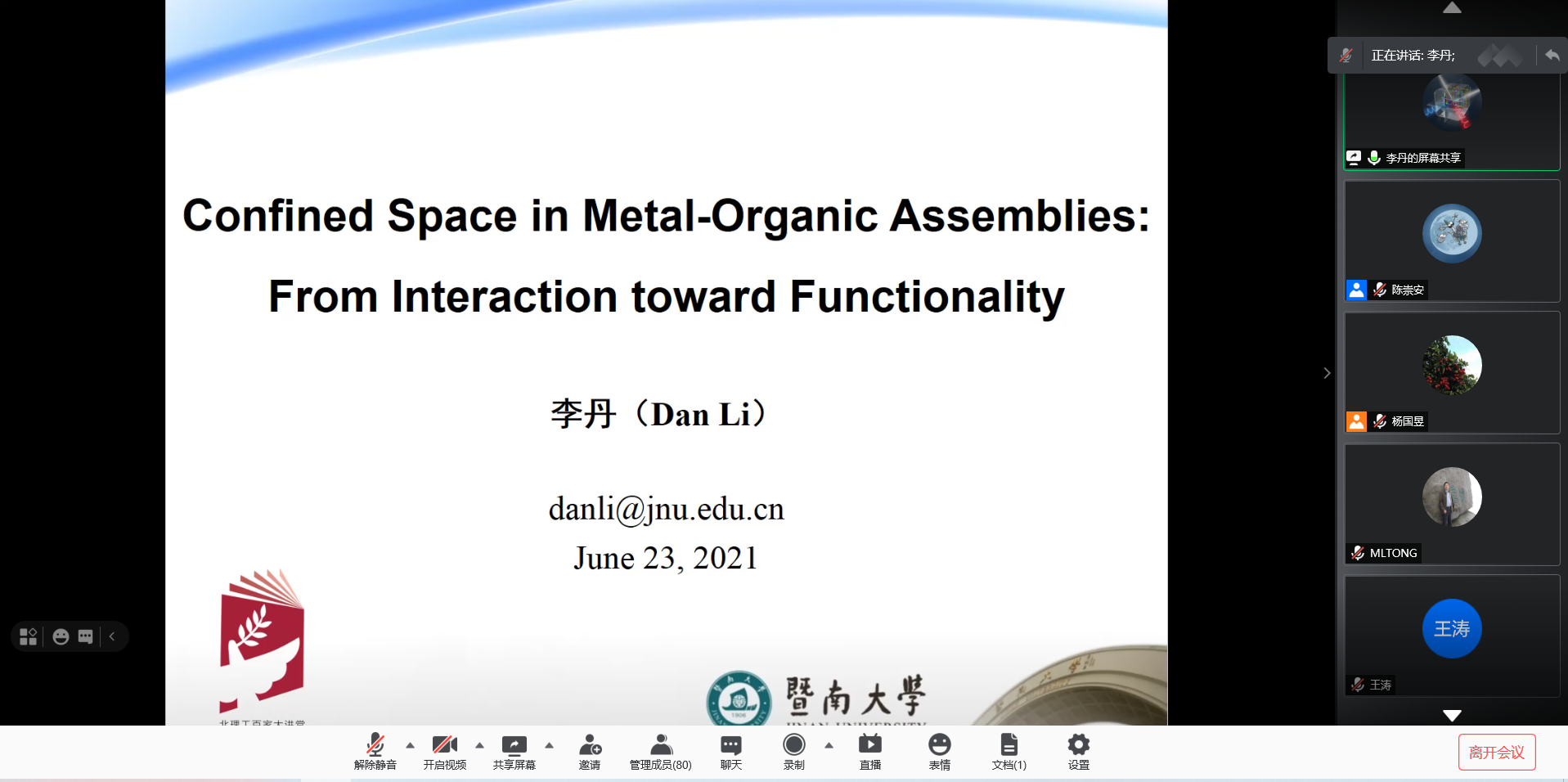 应必威西汉姆联邀请,暨南大学李丹教授于2021年6月23日15:00做客北理工“百家大讲堂”,为我院广大师生带来题为“Confined Space in Metal-Organic Assemblies: From Interaction toward Functionality”的精彩学术报告。本次报告在腾讯会议平台线上进行,由杨国昱老师主持,近百名化院师生参加了报告。