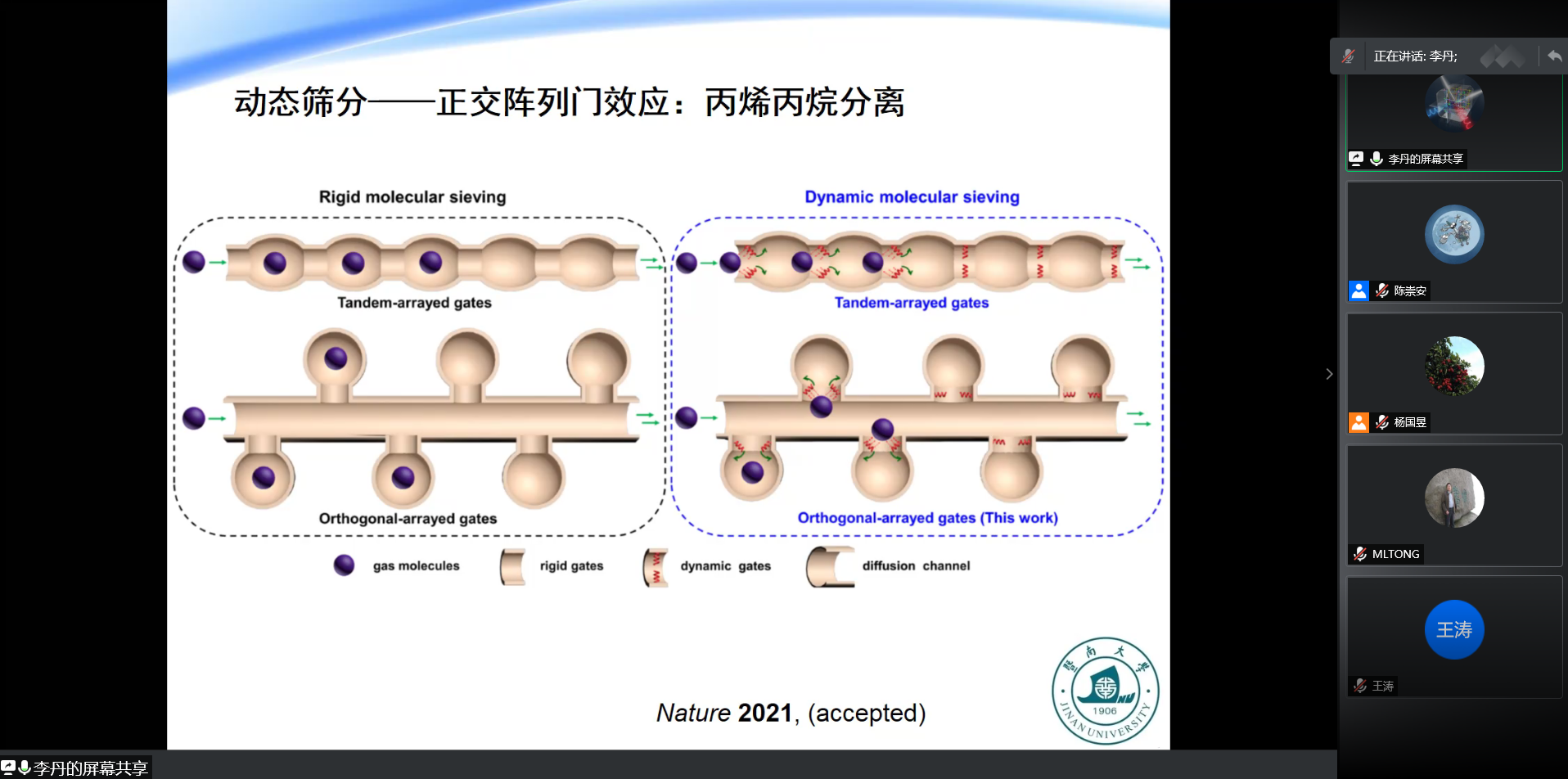 李丹教授首先介绍了超分子配合物丰富多样的结构构筑方式,并由“结构决定性质”的关系出发提出了它们在手性、分离吸附、发光和催化领域的多样化应用。李丹教授介绍了课题组近年来在超分子配合物及其聚集体的分子设计,化学合成,结构表征和功能识别方面的工作,其中重点介绍了选用特定配体构筑的金属有机框架在高效丙烯丙烷分离,特定氨基酸快速检测和超分子手性方面的所取得的丰硕成果。