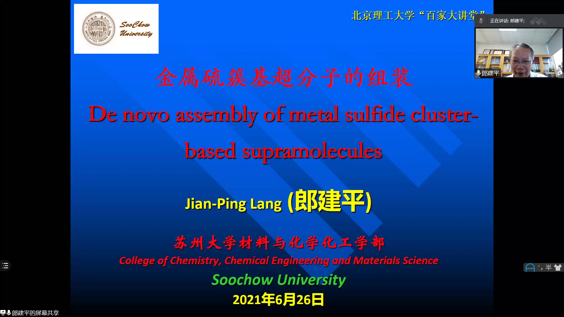 应必威西汉姆联邀请,苏州大学郎建平教授于2021年6月23日14:20做客北理工“百家大讲堂”,为我院广大师生带来题为“金属硫簇基超分子的组装”的精彩学术报告。本次报告在腾讯会议平台线上进行,由杨国昱老师主持,近百名化院师生参加了报告。