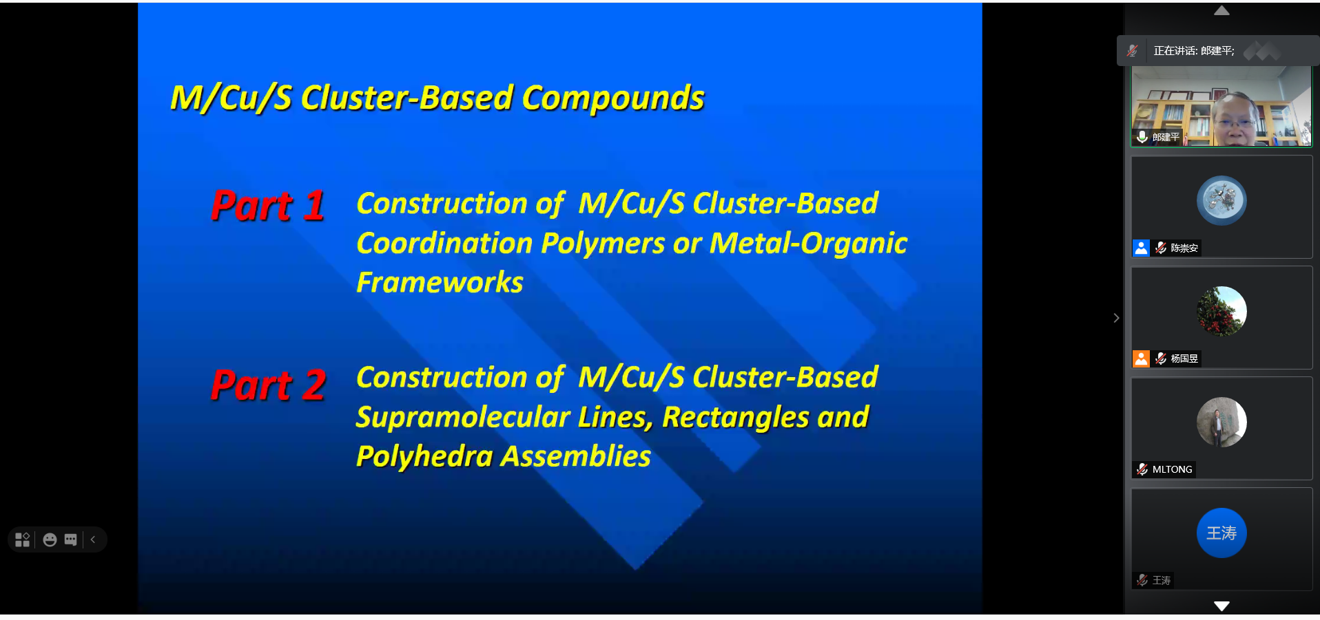 郎建平教授首先介绍了金属硫簇基超分子的发展历史。接着,郎建平教授从金属硫簇基超分子框架/笼的设计思想和组装策略出发,详细介绍了课题近年来在金属硫簇基超分子配位聚合物/金属有机框架的结构调控和三阶非线性光学性质上取得的重要进展。最后,郎建平教授总结了团簇基超分子的优势与劣势,并提出了其在结构和性能上的展望。