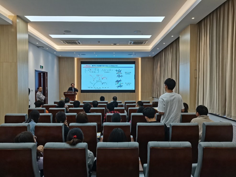 学术报告中,陶端健教授深入介绍了其研究团队以调控离子液体微环境,强化传质分离过程为策略,在面向国家重大需求-化工分离节能减排方面的研究进展。在基础研究方面,陶教授重点从提升体系的溶解性、选择性、扩散传质、吸附容量等角度出发,通过精准调控离子液体酸碱度、粘度和氢键等微环境,实现了对难分离体系的高容量、高选择性和快速的吸收分离。具体内容包括通过调控质子位点合成了一系列质子型离子液体并确定了离子液体结构与粘度、酸碱度之间的半定量关系 (Green Energy Environ., 2019, 4, 49; Ind. Eng. Chem. Res., 2018, 57, 6654)。通过制备低粘度质子型离子液体,强化了CO/N2和SO2/CO2难分离物系选择性吸收和分离(Angew. Chem. Int. Ed., 2016, 55, 7166; Angew. Chem. Int. Ed., 2017, 56, 6843; Chem. Eng. J., 2020, 394, 124859)。在工业应用方面,陶教授介绍了复合质子型离子液体强化提高乙酸乙酯传递通量,设计制备了流程简单、分离能耗低、设备腐蚀小的反应萃取精馏强化分离乙酸乙酯新工艺。此外,陶教授还介绍了精确调控酸性离子液体强化香料萜烯酯的生产工艺。在报告会交流环节中,参会师生就报告内容与陶教授进行了深入且细致的探讨,现场交流和讨论气氛热烈,与会师生收获颇丰。