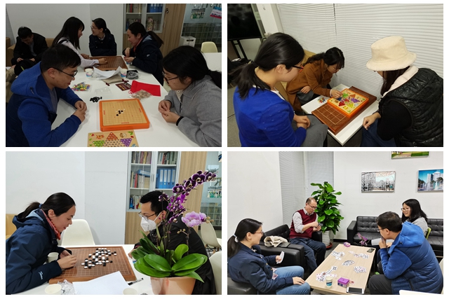本次活动包括象棋、跳棋、五子棋、斗地主、打升级五个项目。比赛为循环赛积分制。参赛选手们聚精会神切磋棋艺、斗智斗勇施展牌技。棋类选手运筹帷幄、精心布局、落棋有声;牌类选手精诚团结,胸有成算,果断出击。活动现场洋溢着紧张而和谐的气氛,欢声阵阵,笑语连连。