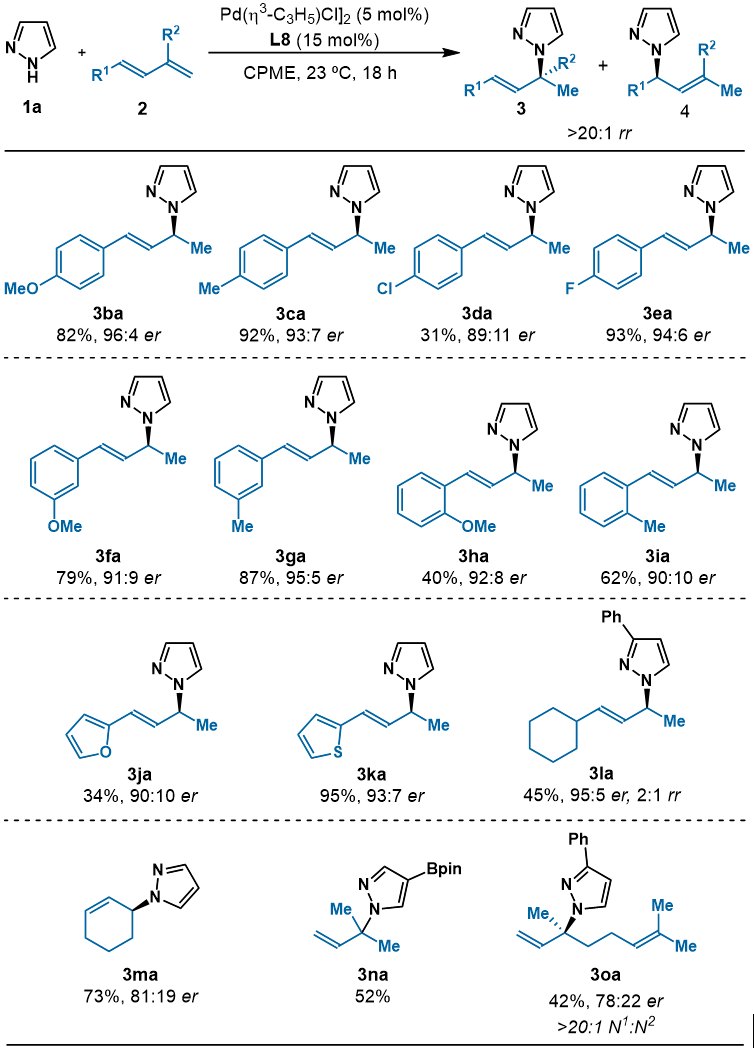吡唑是很多药物和生物活性化合物的核心骨架,将吡唑直接加成到双键上是一种原子经济性的构筑C-N的方法。在共轭二烯的不对称氢胺化反应中,苯胺、仲胺以及伯胺已取得了重要进展,然而吡唑由于亲核性较低,一直以来无法实现其不对称氢胺化反应。作者采用Pd为催化剂,以MeO-BIPHEP为手性配体(L8),以高收率和高选择性得到目标产物,首次实现了吡唑的不对称氢胺化反应(图1)。