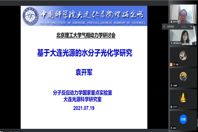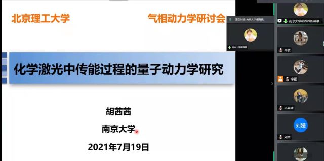 应必威西汉姆联马嘉璧副教授邀请,中科院大连化物所袁开军研究员、南开大学张新星研究员、南京大学胡茜茜副教授、重庆大学勾茜教授于2021年7月19日上午8:30在腾讯会议线上分别作了题为“基于大连光源的水分子光化学研究” 、“气液界面化学动力学” 、“化学激光中传能过程的量子动力学研究” 、 “Rethinking π Interactions: Rotational stories”的精彩学术报告。报告由马嘉璧副教授主持,谢静教授及几十名同学参加了此次报告会。