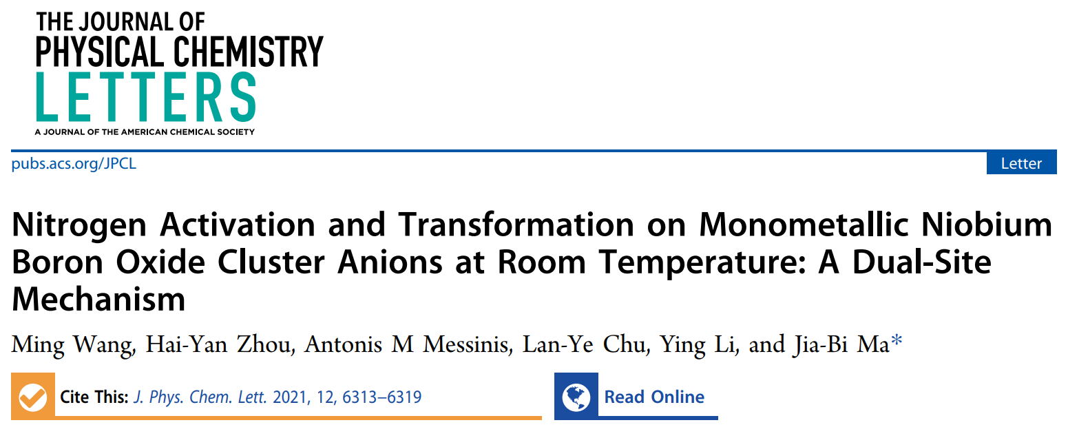 近日,北理工必威西汉姆联马嘉璧副教授团队通过质谱实验和高精度量子化学计算对N2与NbB3O2−气相团簇的反应性及团簇结构进行了深入研究,成功构造了具有双活性位点的、含单个前过渡金属原子的N2催化剂,实现了室温下对N2的活化转化,其活化模式是金属—配体活化(Metal-Ligand Activation,MLA)。相关成果以“Nitrogen Activation and Transformation on Monometallic Niobium Boron Oxide Cluster Anions at Room Temperature: A Dual-Site Mechanism”为题,发表在国际权威期刊《The Journal of Physical Chemistry Letters》(2021, 12, 6313-6319)。必威西汉姆联博士生王明为该论文的第一作者,我校的马嘉璧副教授为论文的通讯作者。