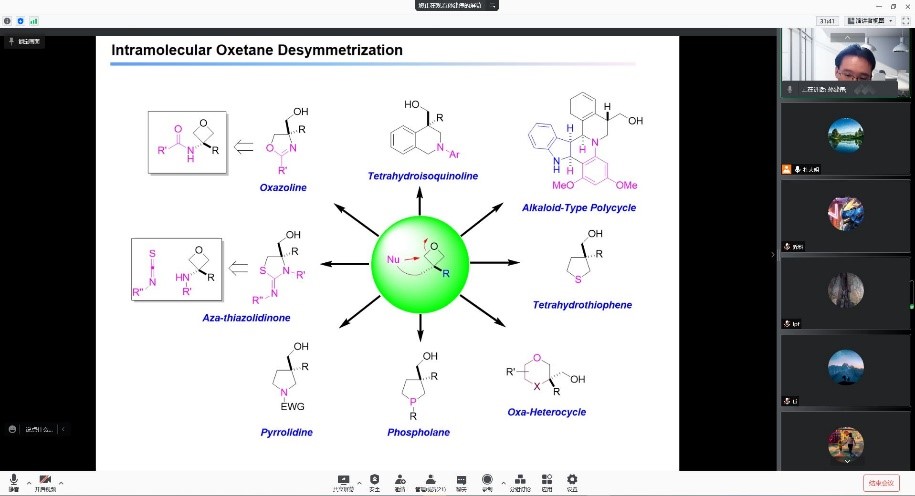 孙建伟教授从不对称有机催化的发展背景出发,系统介绍了手性Brønsted酸催化含氧、氮四元杂环的不对称开环,对醌、邻醌甲基化物的选择性加成,四芳基甲烷的不对称合成,吲哚去芳构化亚胺甲基化物的不对称反应,以及复杂手性螺环磷酸骨架的设计合成与应用最新研究进展。孙建伟教授从如何设计以及如何发展解决这些不对称催化反应远程控制的新策略,都做了细致深入的讲解。这次学术报告的信息量很大,学习价值极高。